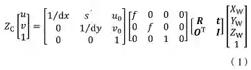 式中:( XW, YW, ZW, 1 )^T 是点的世界坐标,与其对应的摄像机齐次坐标是 ( XC, YC, ZC, 1 )^T,dx 与 dy 分别表示每个像素在横、纵轴上的物理单位下的大小,f 是摄像机的焦距,s' 表示因摄像机成像平面坐标轴相互不正交引出的倾斜因子(Skew Factor),R 代表旋转矩阵(为一个 3×3 的正交单位矩阵),t 代表平移向量,I 是元素全为 1 的对角矩阵,O=(0, 0, 0)^T。