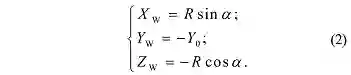 毫米波雷达获取的前方障碍物信息是在极坐标下的二维信息,将障碍物 P 的极坐标下的二维信息转换到直角坐标系中,雷达坐标系的 X0O0Z0 平面与世界坐标系的 XOZ 平面平行,两平面之间的距离为 Y0,通过雷达可以得到前方车辆中心点投影到雷达扫射平面内的点 P 相对雷达的距离 R 和角度 α,确定点 P 在世界坐标系下的坐标,转换关系如下: