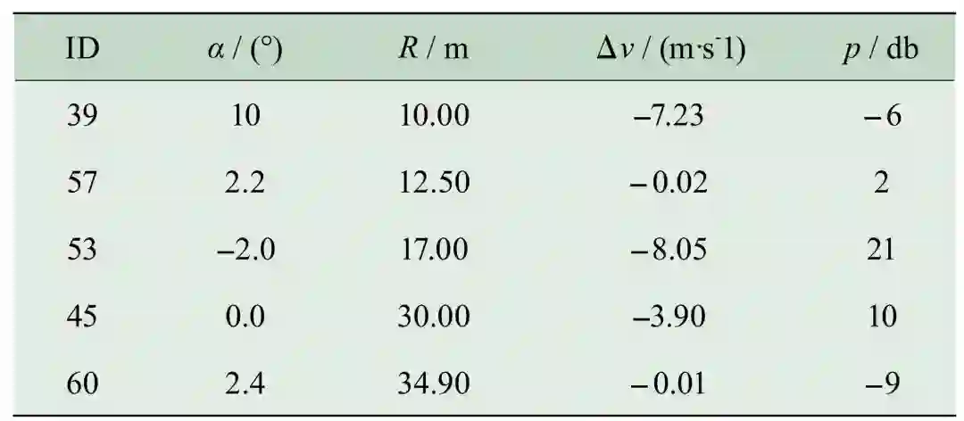 表 1 中:ID 表示雷达检测得到的目标信号的标准帧号;α、R、Δv 分别为本车与目标信号的相对角度、相对距离、相对速度(∆v = v1 - v0,v1 为目标速度,v0 为本车速度);p 从目标返回信号的强度,即反射率。