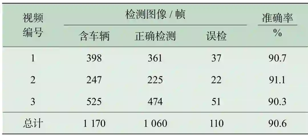 经统计部分视频数据并与人员主观判断比较,其中包含车辆图像共 1170 帧,识别出车辆尾灯的图像共 1060 帧,准确率达 90.6%。因此,本文方法在夜间环境下具有较好的检测效果;车辆所处环境的光照条件较差,存在路灯、地面反光等干扰光源,且路灯与车灯相似,但检测系统仍可以准确识别车辆尾灯,标记出车灯位置。