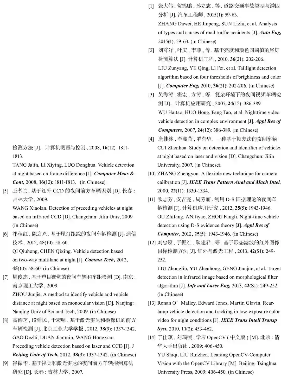 道路交通事故中由追尾相撞导致的事故占很大比例,而夜间交通事故尤为严重,约占交通事故总数的 40%。夜间车辆检测技术已成为智能车辆安全辅助驾驶系统的重要组成部分,用于准确地识别夜间前方车辆,为驾驶员及时提供前方车辆信息及路况,降低夜间交通事故的发生 [1]。