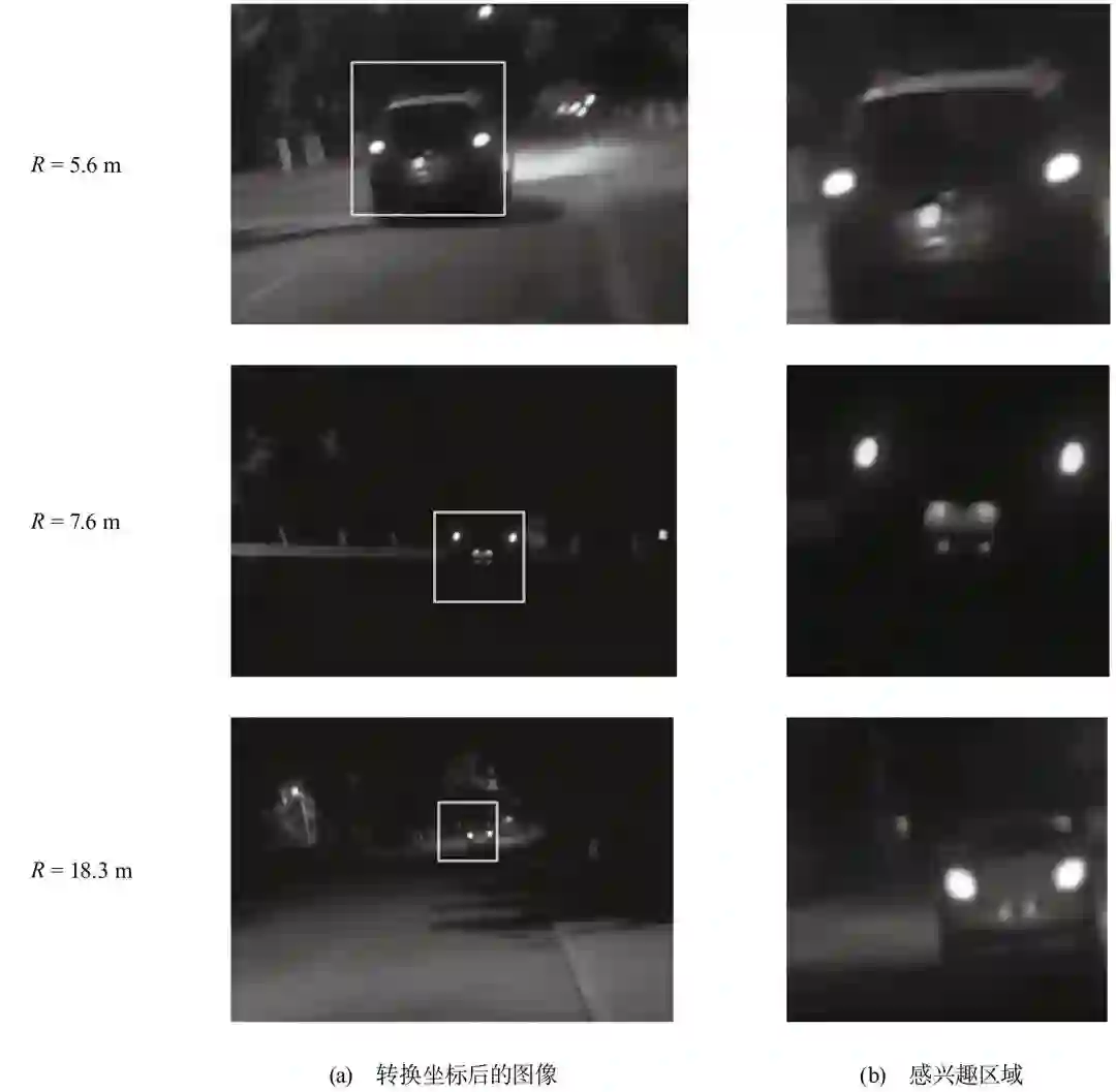 雷达扫描图如图 2 所示。雷达坐标系中的目标经坐标转换关系在图像上形成的感兴趣区域如图 3 中的 (a) 列所示。动态感兴趣区域的大小会随目标的距离发生变化,以更适合的尺寸截取感兴趣区域图像进行下一步检测验证,缩小了检测范围,从而减少计算量提高检测实时性。获取的感兴趣区域图像如图 3b 列所示。
