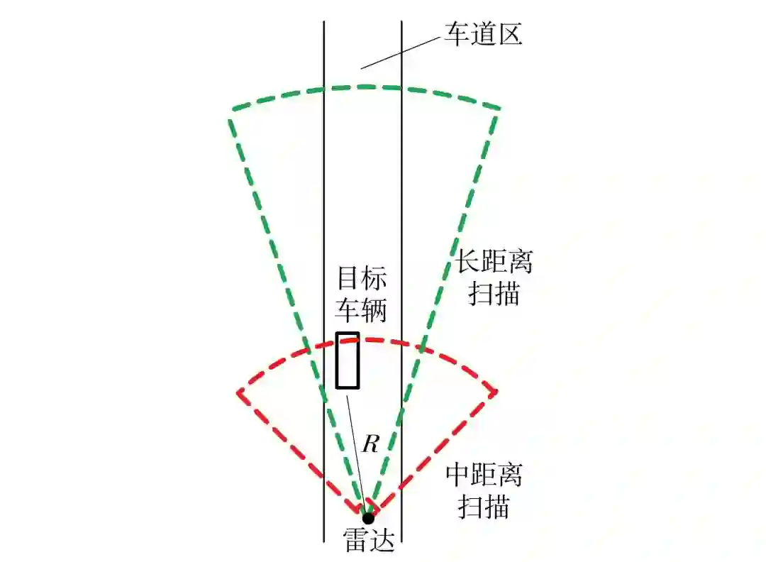 长距离的毫米波雷达扫描范围是 1~175 m,中距离是 1~60 m。距离小于 1 m 时雷达就不能识别物体。以避免车辆行驶过程中与前方车辆发生追尾碰撞为出发点,在有效目标选择过程中最关注的是与本车位于同一车道的前方最近车辆。当 Δv<0,有出现追尾事故的可能。因此,把雷达扫描近距离 1~60 m 内、离本车最近且 Δv<0 的车辆作为初选目标。
