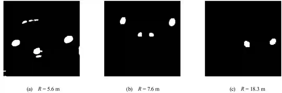 通过对采集到的不同距离的 253 张像素为 768×576 的图片进行处理后统计,车辆明亮块的面积最小不低于 10,最大不超于 300,同一车辆的左右尾灯亮块之间的水平距离不小于 20 大于 300。同时,文献 [13] 提出 0~100 m 的距离范围内,在不同距离采集到的图像上的车辆尾灯亮块面积不小于 10,因此先通过亮斑的面积阈值和水平距离阈值去除感兴趣区域部分的一些干扰亮斑。