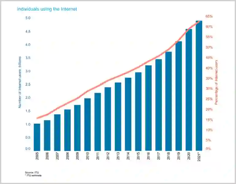 根据联合国国际电信联盟(ITU)去年披露的数据,截止2021年,全球使用互联网的人数预计将达到49亿人,而这一数据大约只占全球总人口的63%。