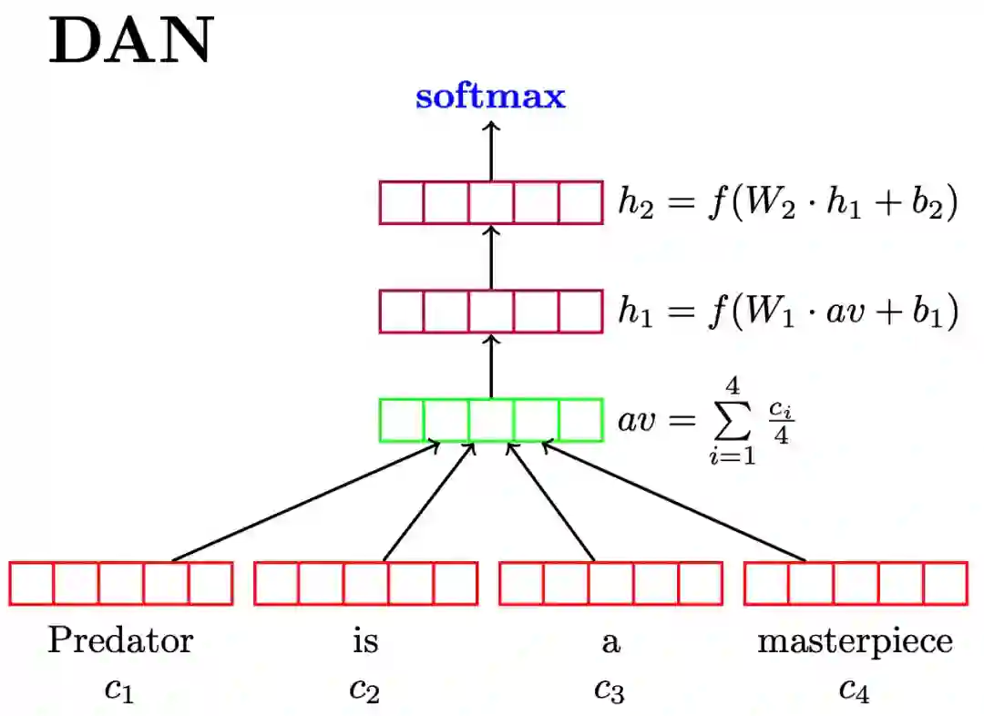 3)提出了深度平均网络(DAN)。该网络在传统的 NBOW 模型的基础上叠加了非线性层,取得了与句法功能相当或更好的性能。