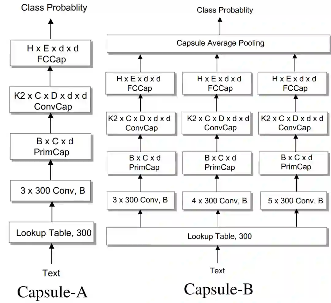 Capsule-B 的基本结构与 Capsule-A 相似,只是在 N-gram 卷积层中采用了三个平行网络,过滤窗口(N)为 3、4、5(见图 11)。全连接的胶囊层的最终输出被送入平均池以产生最终结果。通过这种方式,Capsule-B 可以学习到更有意义和更全面的文本表述。