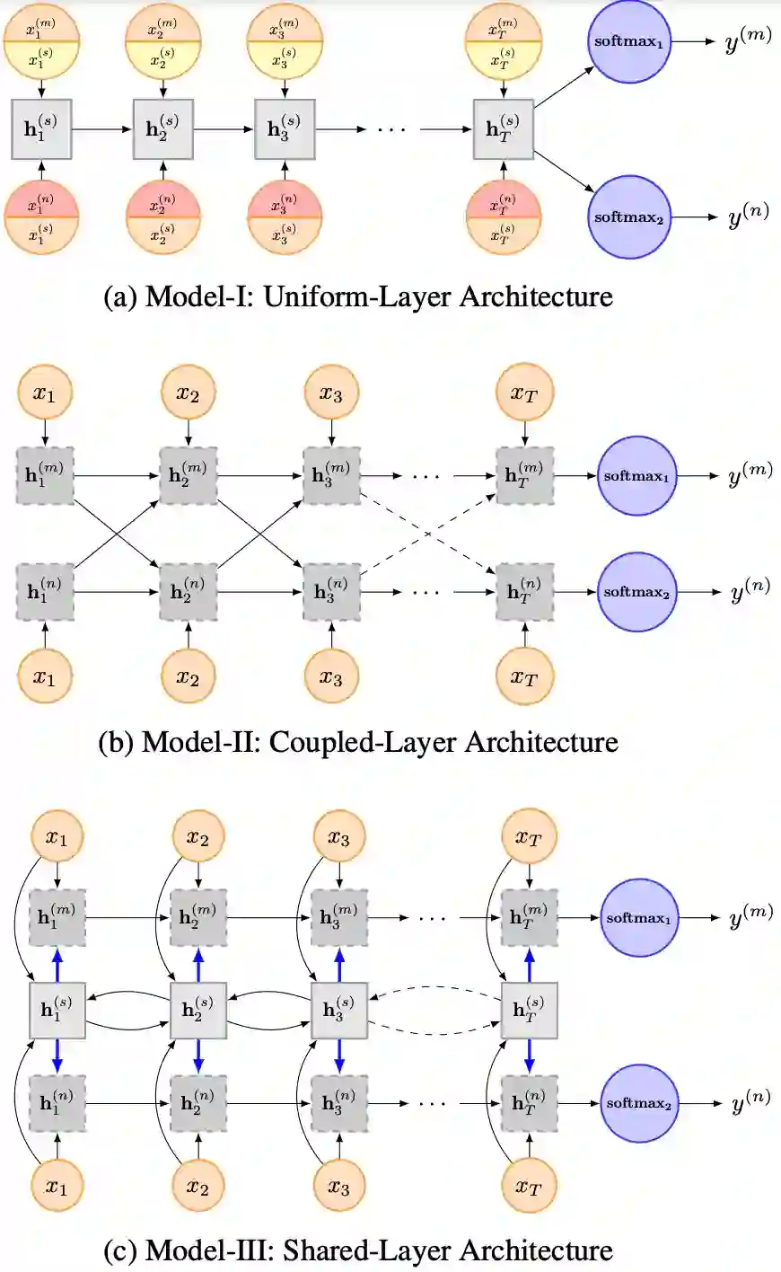 Multi-task 的文章发表与 IJCAI 2016。在本文中,作者使用多任务学习框架来共同学习多个相关任务(相对于多个任务的训练数据可以共享),以应对数据不足的问题。本文提出了三种不同的基于递归神经网络的信息共享机制,以针对特定任务和共享层对文本进行建模。整个网络在这些任务上进行联合训练。