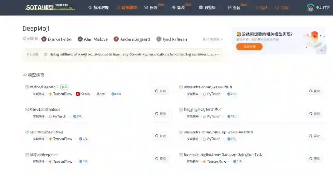 | DeepMoji | https://sota.jiqizhixin.com/models/models/9f50abc9-d67e-483a-bb44-e10c3baeb327 收录实现数量:8 支持框架:TensorFlow、PyTorch、Keras |