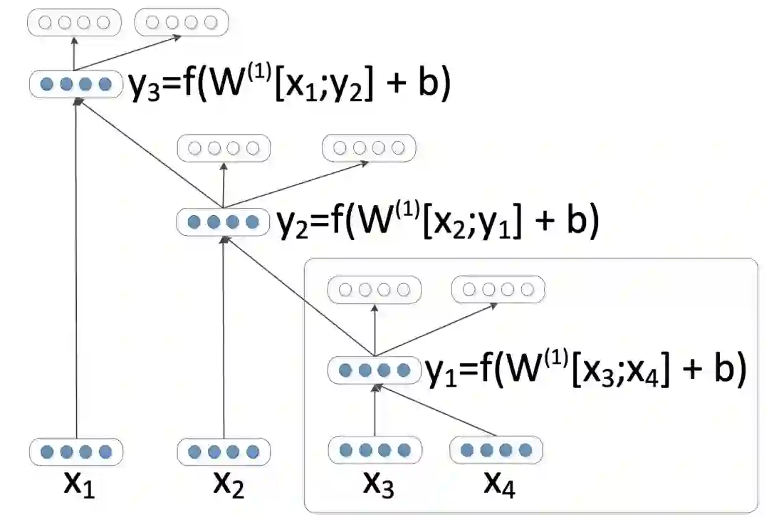 图2. 递归自动编码器在二进制树上的应用说明。没有填充的节点只用于计算重建误差。一个标准的自动编码器(方框内)在树的每个节点上都被重新使用