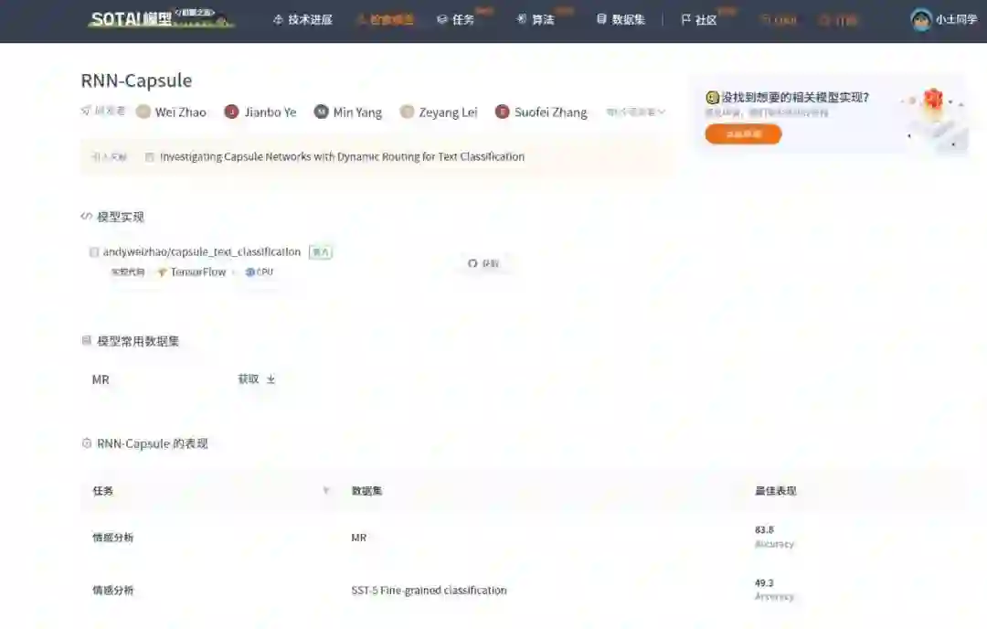 当前 SOTA!平台收录 RNN-Capsule 共 1 个模型实现资源,支持框架:TensorFlow。