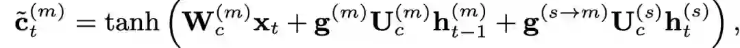 模型 III 中,每个任务都拥有一个共享的 BI-LSTM 层,同时各自有一个 LSTM 层,LSTM 的输入包括 char 及 BI-LSTM 在该时刻的隐层输出,与模型 II 一样,作者也修改了 cell 的计算公式