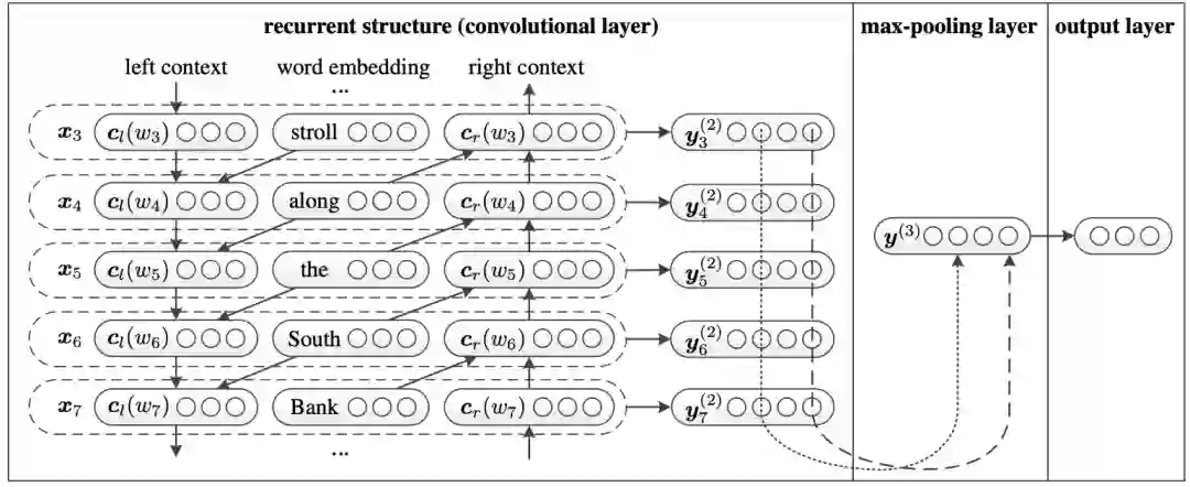 TextRCNN 相关论文首次发表在 AAAI 2015 中。在 TextCNN 网络中,网络结构采用“卷积层+池化层”的形式,卷积层用于提取 n-gram 类型的特征,在 RCNN(循环卷积神经网络)中,卷积层的特征提取的功能被 RNN 替代,即通过 RNN 取代 TextCNN的特征提取。RNN 的优点是能够更好地捕捉上下文信息,有利于捕获长文本的语义。因此整体结构变为了 RNN+池化层,所以叫 RCNN。