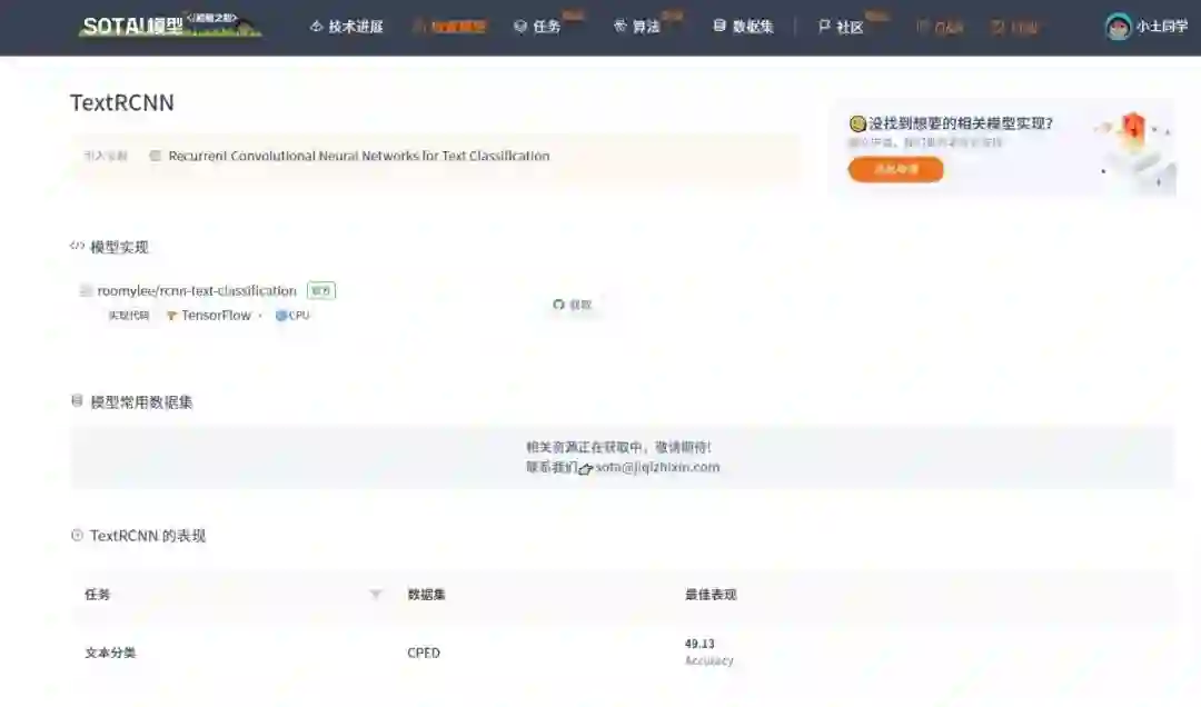 | TextRCNN | 前往 SOTA!模型平台获取实现资源:https://sota.jiqizhixin.com/models/models/a5a82cbe-98b7-4f3d-87ae-f9fd59caa55e |
