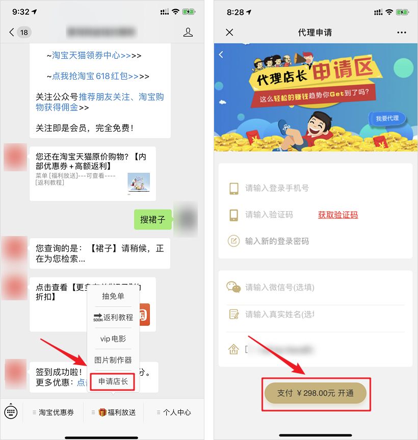 然而,淘客们对这些并不满足,他们有的还设置了“会员模式”,引导用户开通代理使用这个工具来分享赚钱,让用户缴纳一定的会员费用(200~400 左右),并鼓励他们发展下线。