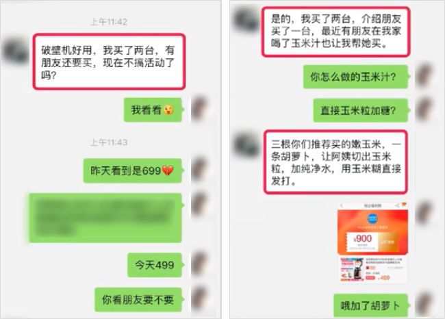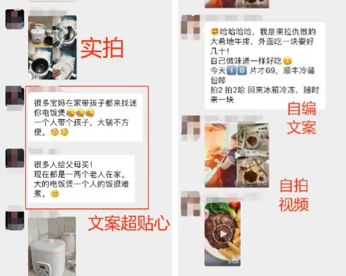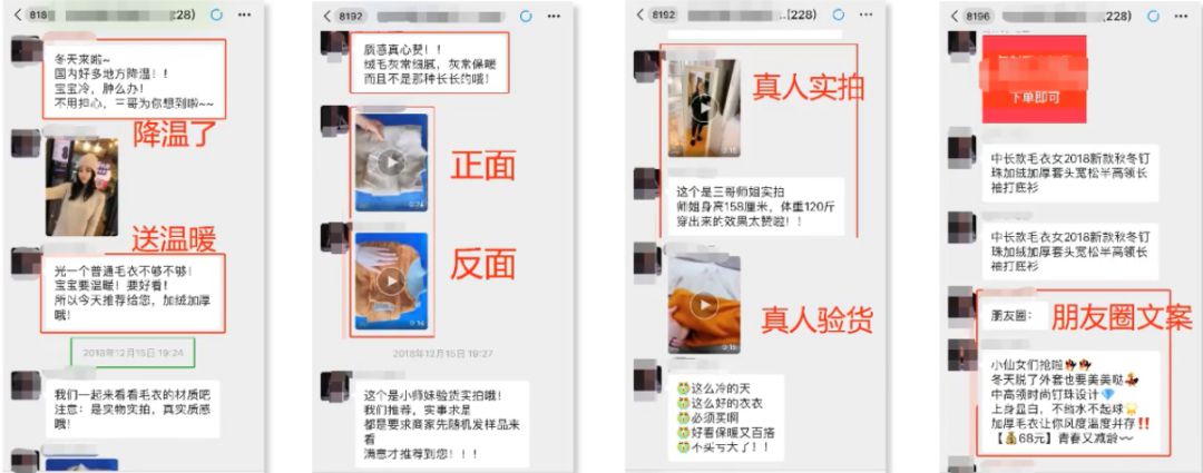 除了强调价格之外,他们还会发一些突出产品卖点的细节图片,比如加绒毛衣,拍细节围绕加绒展开写文案;再比如卖羽绒被时,把里面的绒展示给用户看,并引导已经购买的群友发验货小视频。