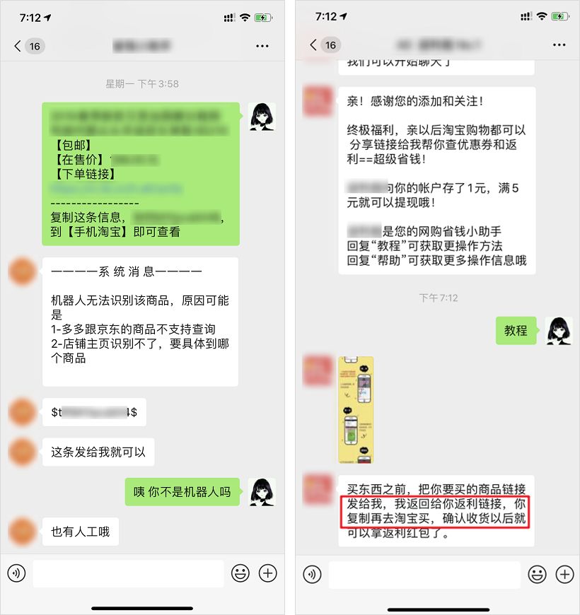 这种“割法”基本上有 2 种方式,一个是利用微信公众号或微信个人号绑定机器人,通过设置多层级佣金和引导用户成为会员,赚取会员费;另外一种方式是号称做淘宝客培训,利用各种共享类 App 发展下线,引导小白用户成为“合伙人”。