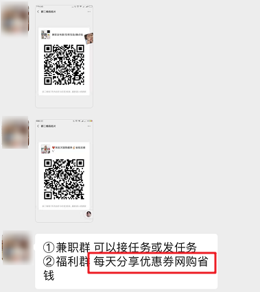 记得有一次我们在卧底兼职社群的时候就碰到了淘宝客,群主当时就给我发送了 2 个群二维码,其中一个就是淘宝隐藏优惠券的群。