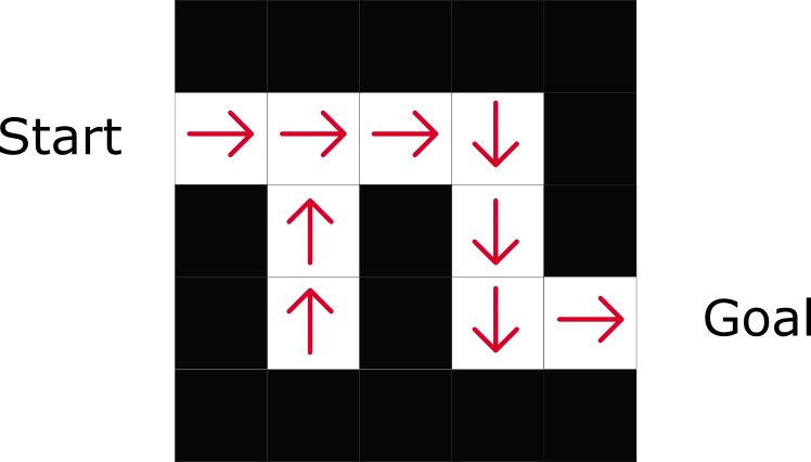 在迷宫示例中,在每个步骤中我们将采用最大值:-7,然后是-6,然后是-5(依此类推)以达到目标。