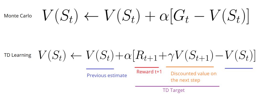 TD学习不会等到剧集结束时更新最大预期未来奖励估计:它将更新其在该经历中发生的非最终状态St的价值估计V.