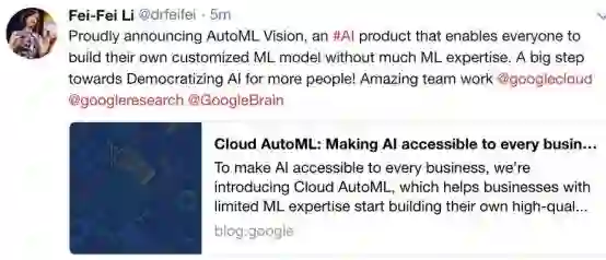 【导读】1月27日,Kirti Bakshi在博文中介绍了Cloud AutoML,之前李飞飞在其推特上连续发文,为其团队的产品Cloud AutoML疯狂打call,激动之情溢于言表。Cloud AutoML提供自动生成ML模型服务,致力于帮助AI从业者更快、更简单、更便捷地构建ML模型,大幅降低构建ML系统的门槛,推动AI民主化进程。在本文,Kirti Bakshi系统地梳理了Cloud AutoML的相关内容。专知内容组编辑整理。