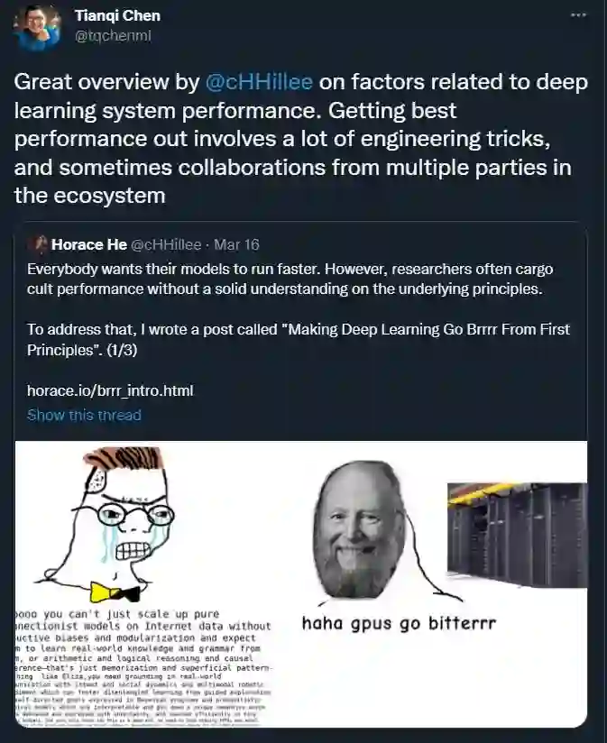 在这篇文章中,Horace He 从三个角度分析可能存在的瓶颈:计算、内存带宽和额外开销,并提供了一些方式去判断当前处于哪一个瓶颈,有助于我们更加有针对性地加速系统。这篇文章得到了陈天奇等多位资深研究者、开发者的赞赏。