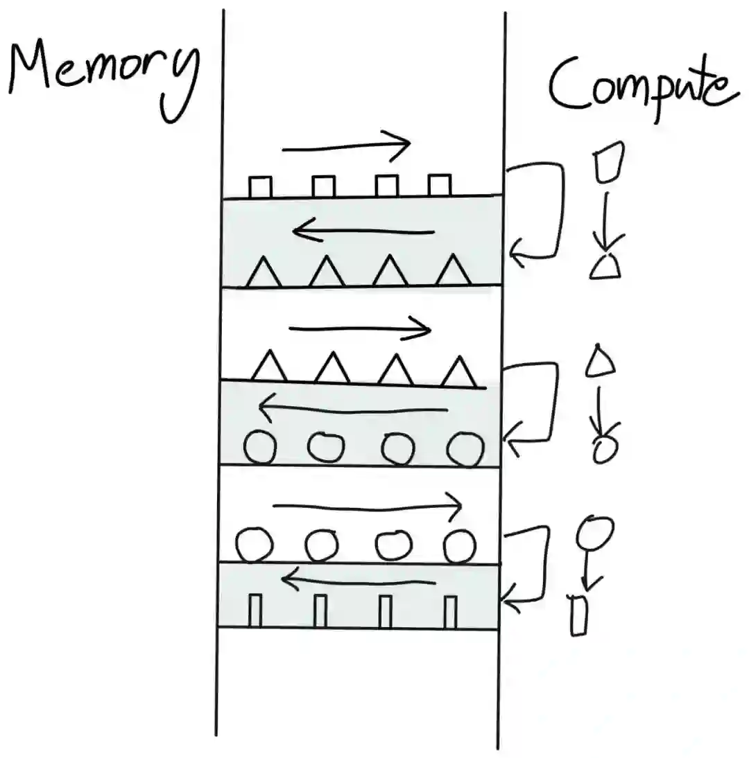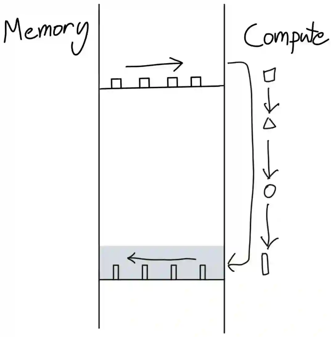 值得注意的是:我们每执行一次 GPU 核运算都需要把数据运出和运回到我们的仓库 ——DRAM。