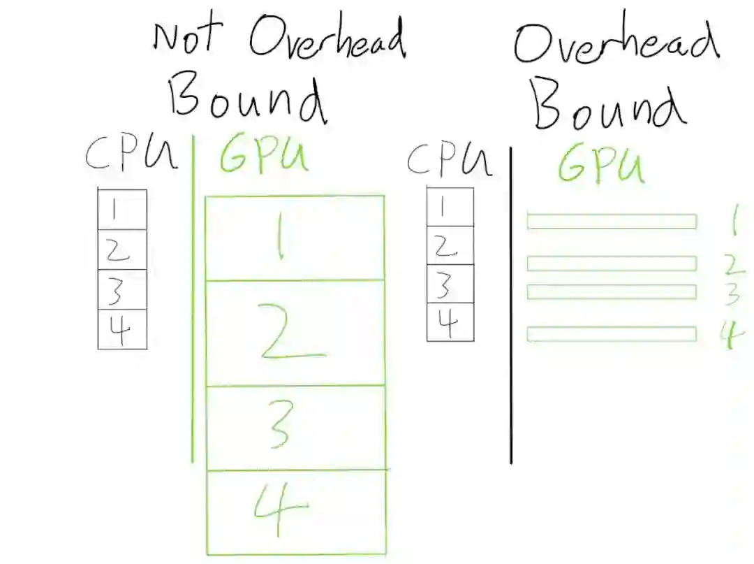那么,如何判断你是否处于这个问题中?由于额外开销通常不会随着问题的规模变化而变化(而计算和内存会),所以最简单的判断方法是简单地增加数据的大小。如果运行时间不是按比例增加,应该可以说遇到了开销限制。例如,如果将批大小翻倍,但运行时间仅增加 10%,则可能会受到开销限制。
