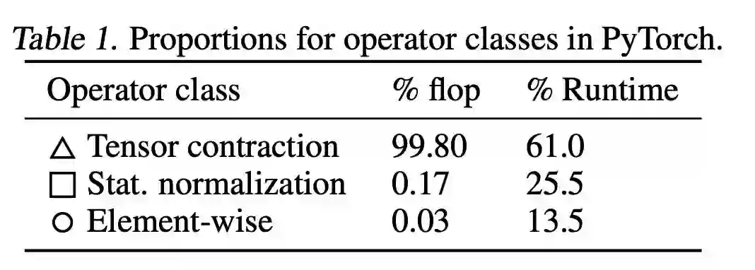 事实上,归一化运算和逐点(pointwise)运算使用的 FLOPS 仅为矩阵乘法的 1/250 和 1/700。那为什么非矩阵乘法运算会远比它们应该使用的运行时间更多呢?