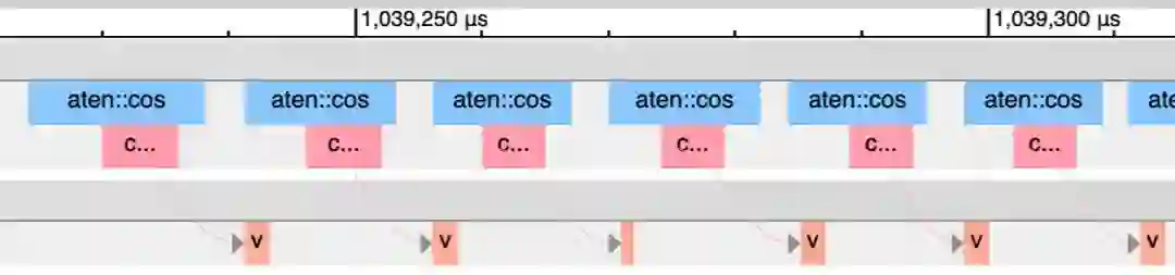 另一种方法是使用 PyTorch 分析器。如下图,粉红色块显示了 CPU 内核与 GPU 内核的匹配情况。