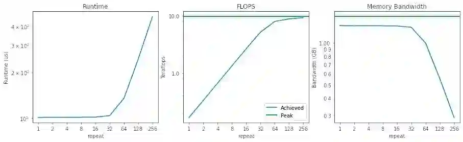 并使用融合编译器对其进行基准测试,就可以计算每个 repeat 值的 FLOPS 和内存带宽。增大 repeat 值是在不增加内存访问的情况下增加计算量的简单方法 - 这也称为增加计算强度 (compute intensity)。
