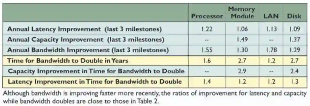 与内存带宽相比,计算的增长速度增加了最大化计算利用率的难度。下表显示了 CPU 的 FLOPS 翻倍和内存带宽翻倍的时间 (重点关注黄色一栏)。