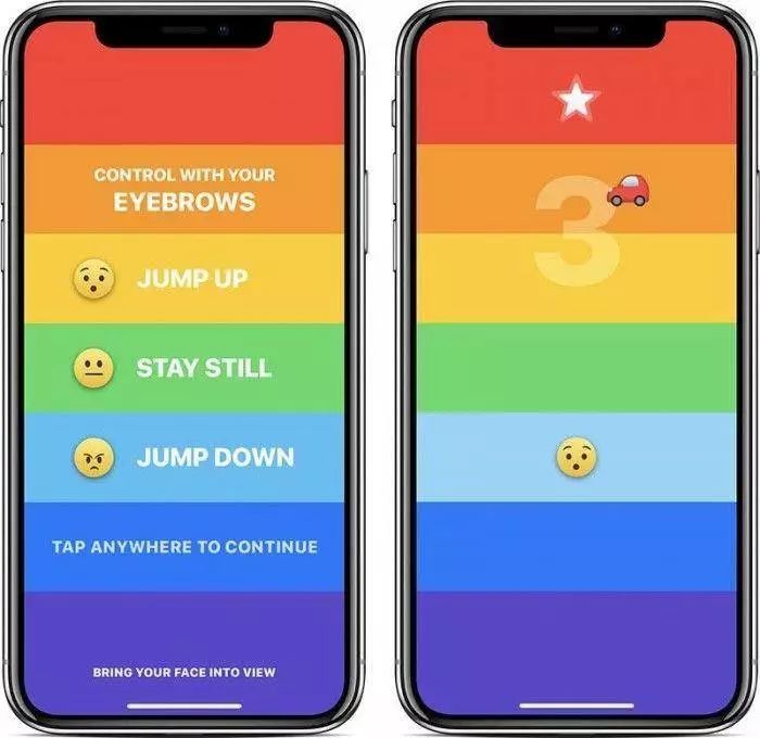 游戏的操作方式如此吸引人,你也许会好奇这到底是怎么做到的。这里不妨先回想一下 iPhone X 发布会上让很多人印象深刻的 Animoji,通过 iPhone 特殊的前置摄像头,人的面部表情就变成了熊猫、公鸡、狗狗等各种各样的虚拟形象,是不是和今天介绍的这款小游戏的操作很像呢?