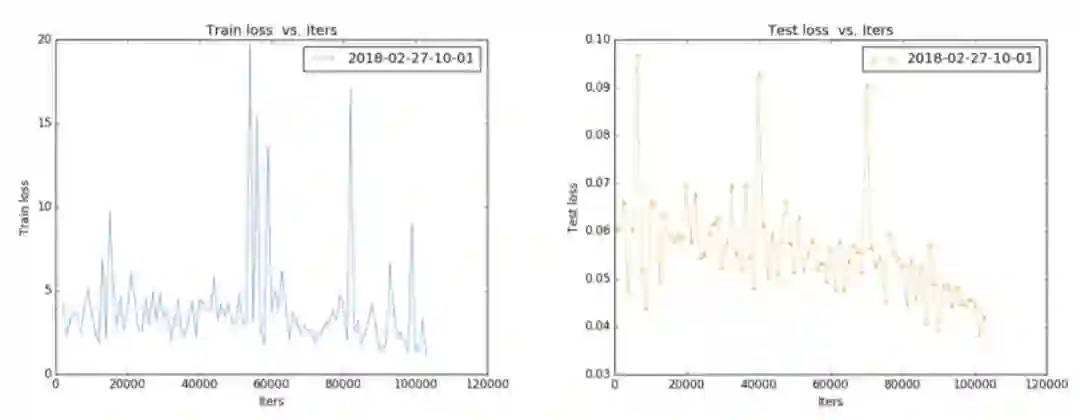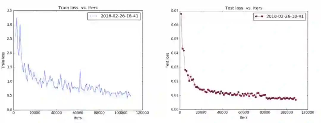 Train loss 大概是在 0.005~0.006,Test loss 是在 0.007~0.008(注:训练的时候 loss_weighs 设置为 100,因此上图数量级上不一致)