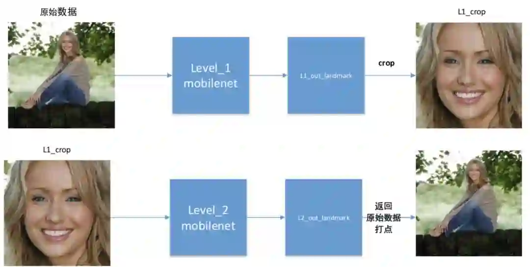 本实验采用两级级联 MobileNet-V2,分别称之为 level_1 和 level_2,由于个人精力有限,level_1 和 level_2 采用完全相同的网络结构。level_1 进行粗略的关键点定位;依据 level_1 输出的关键点进行人脸区域裁剪,获得人脸区域图像作为 level_2 的输入,最终关键点定位信息由 level_2 进行输出。流程如下图所示: