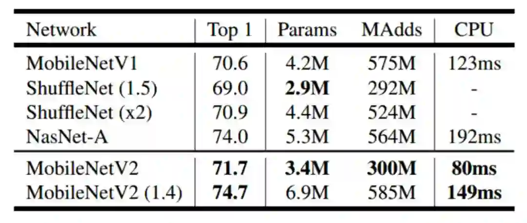 MobileNet-V2[15] 由 Google 团队于 2018 年 1 月公布在 arXiv 上,是一种短小精悍的模型,仅数 M 的模型就在 ImageNet 上获得 74.7% 的准确率(top-1),具体分类性能如下: