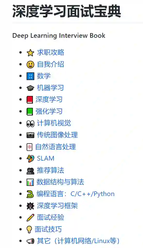 深度学习面试宝典是 Amusi 整理的一个AI算法岗面试题库,累计900+个问题与解答。涉及的领域众多,具体如下。同时求职群里每周都会更新很多面经,方便查漏补缺!