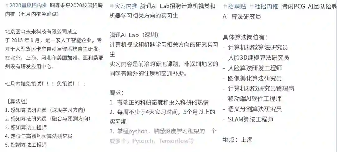群里已分享数百个的内推机会(涵盖BAT/头条/商汤/旷视/等公司),还有大量专门提前批和正式批内推,以及日常实习内推: