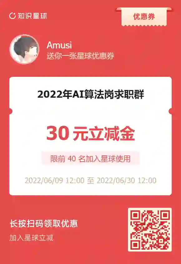 Amusi 在此赠送限量的 40 张 AI算法岗求职群(知识星球)30元优惠券!今年最大的优惠力度!今年、明年和未来几年要找工作的同学们可以抢起来了~注:2022年是针对2022届、2023届,但星球一直不会变(24届及以后都会在里面),里面的内容永存!