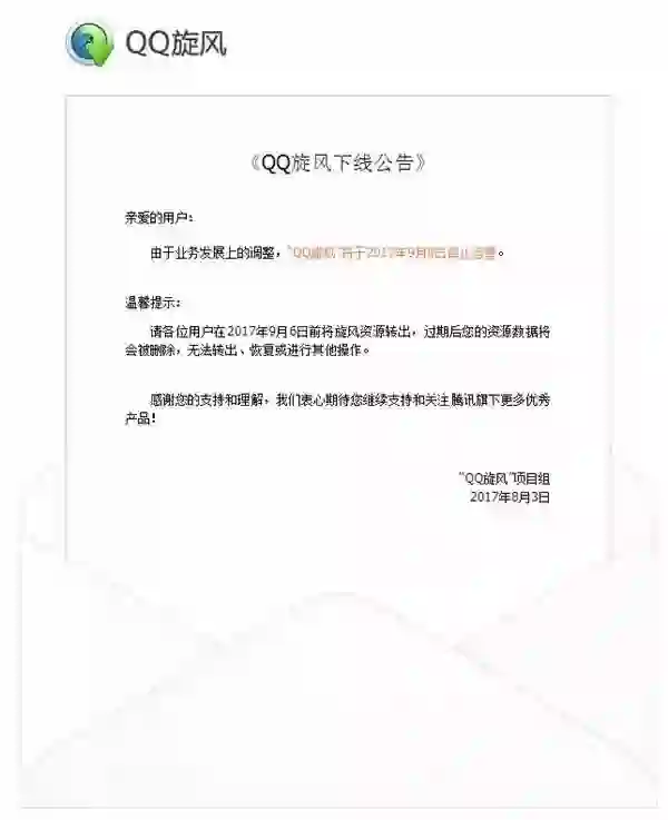 QQ旋风官方表示,请各位用户在9月6日前将旋风资源转出,过期后资源数据将会被删除,无法转出、恢复或进行其它操作。