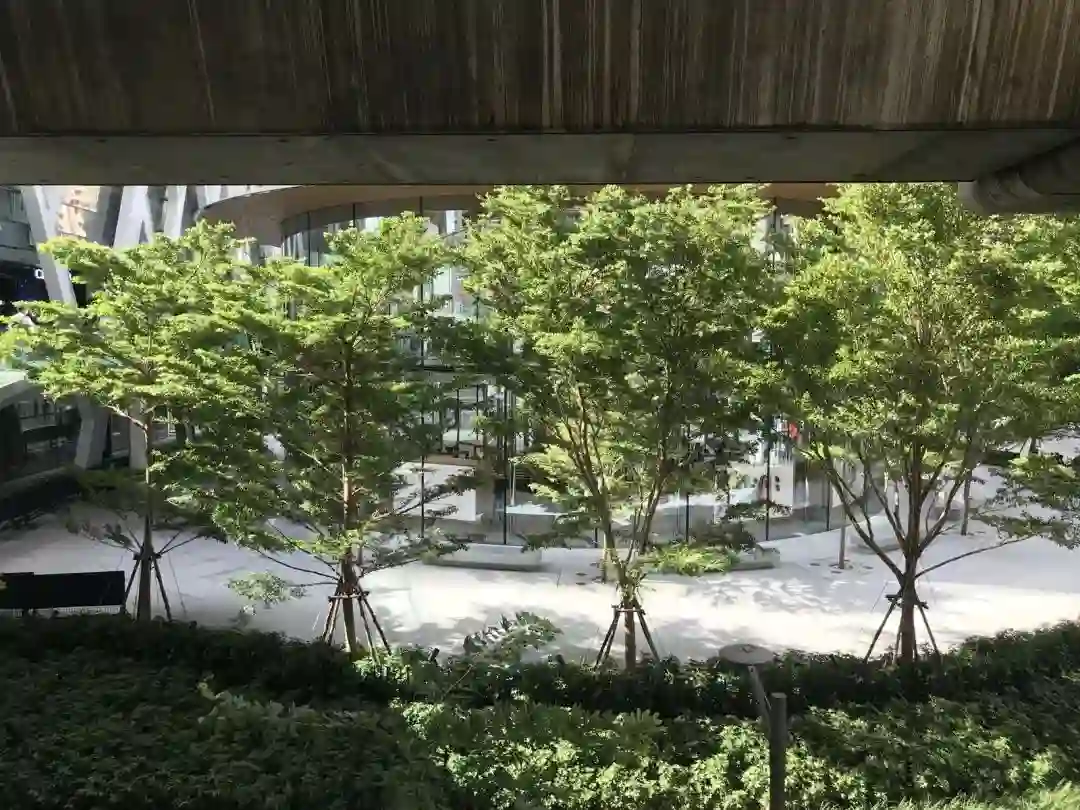 店铺的外部被树木包围以遮挡阳光,大玻璃窗则可以俯瞰广场和下方的街道。
