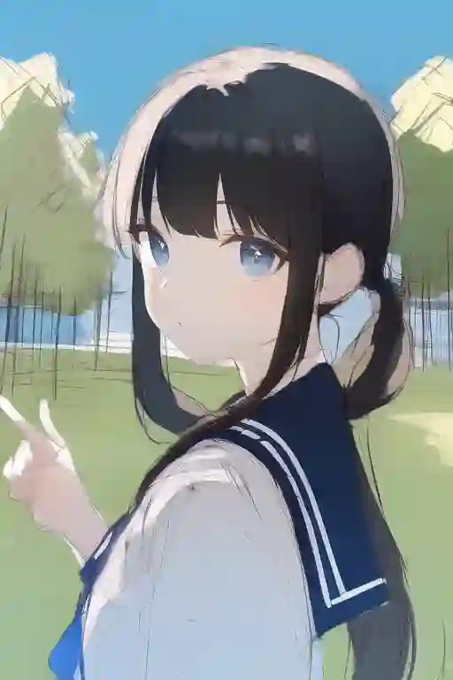 它的生成效果如下:比如站在树的中间、留着黑色长发、梳着刘海、比着手势的女孩: