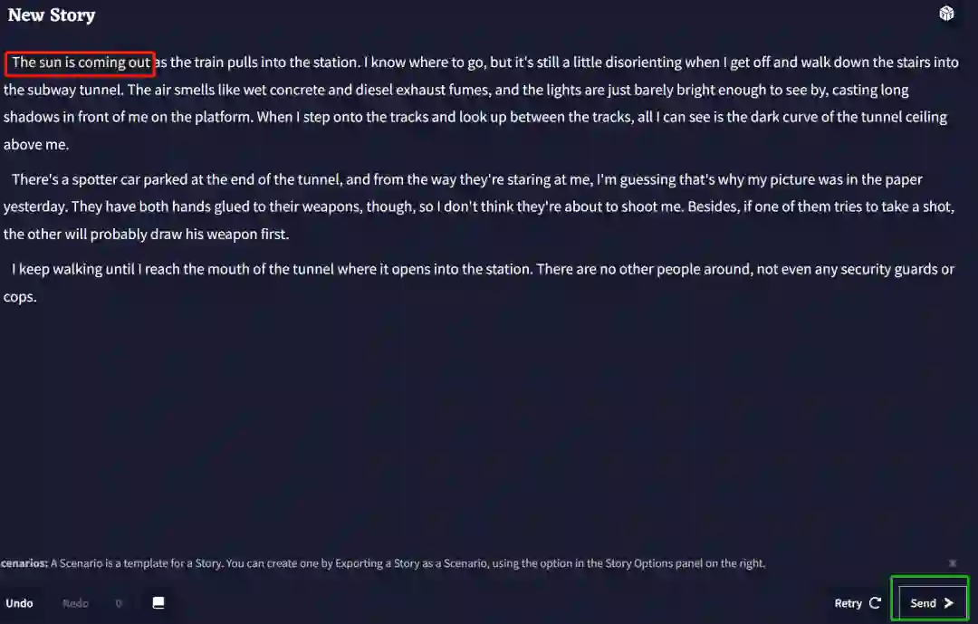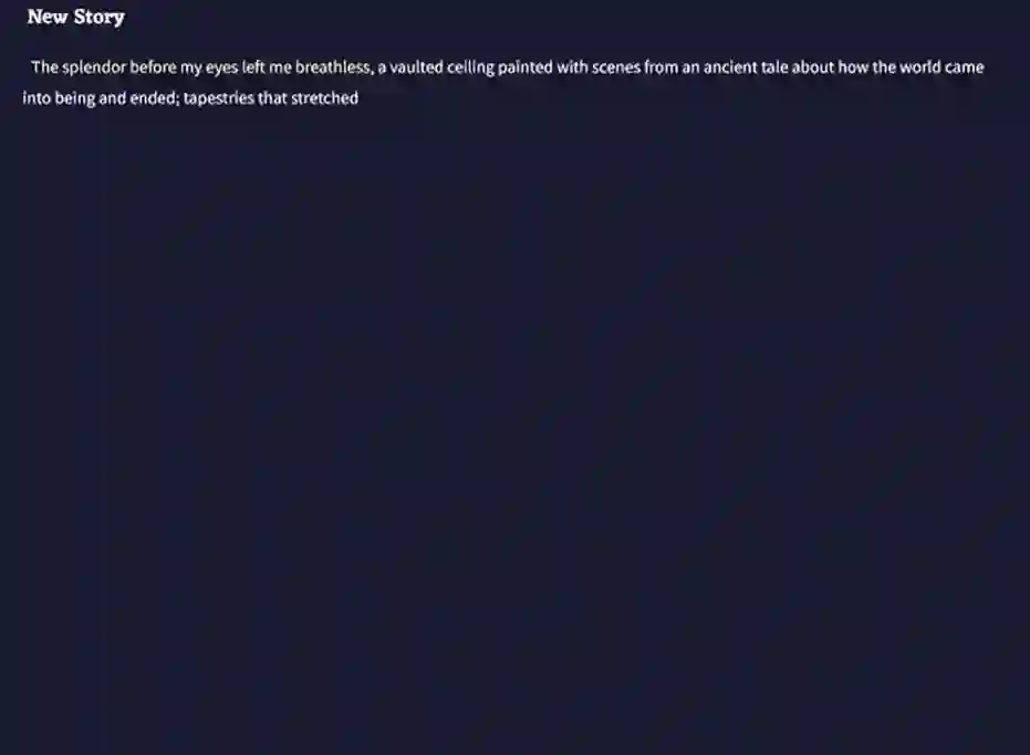 我们也上手试了一下,下图红框中是输入的提示文本「太阳出来了」,后面都是 AI 续写的内容,我们进行了适当的翻译:「火车进站的一瞬间,太阳出来了。我不知道去哪里,但是当我走下火车进入隧道时,还是有点迷失方向。空气中混杂着潮湿的混凝土和汽车尾气味,灯光勉强够亮,在我面前的平台上投下长长的阴影。当我踏上铁轨并在铁轨之间抬头时,我所能看到的只是我上方隧道天花板的黑暗曲线……」