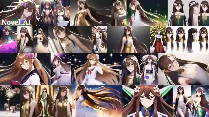 假如你输入一堆关键词,它也能生成,例如输入提示「褐色的头发,很长的头发,眼睛之间的头发,发花,花朵,花发夹,超长的头发,绿色的眼睛,髻金色的脖子,瘦的,高的,瘦的」等关键词,NovelAI 生成效果如下: