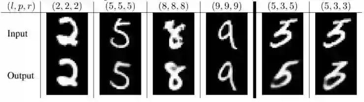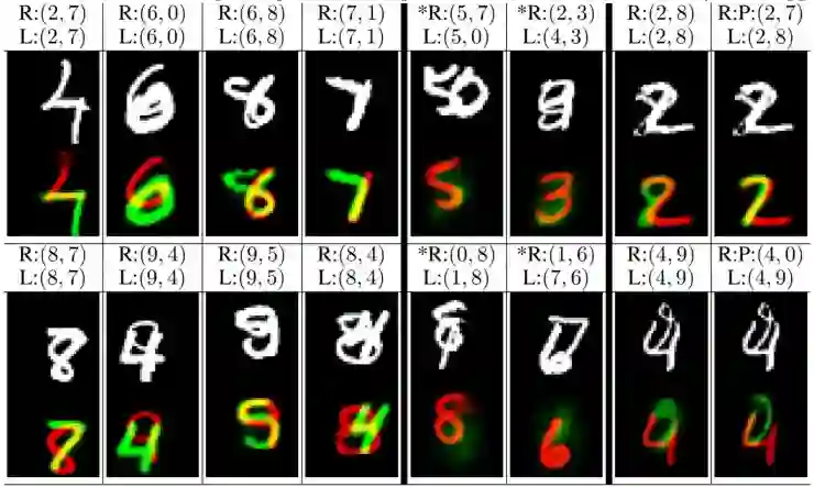 如图中靠下的图像所示,两个重建出的互相交叠的数字分别显示为绿色和红色的。靠上的图显示的是输入的图像。表示图像中两个数字的标签;表示用于重建的两个数字。最右边的两列显示了从标签和从预测重建的两个错误分类样例。在例子中,模型将8错判成7;在的例子中,模型将9错判成0。其他的列都分类正确并且显示了模型不仅仅考虑了所有的像素同时能够在非常困难的场景下将一个像素分配给两个数字(1-4列)。值得说明的是,在数据集产生的过程中,像素的值都会被剪裁到1以内。两个含“*”的列显示了重建的数字既不是标签值也不是预测值。这些列显示模型不仅仅找到了所有存在的数字的最佳匹配,甚至还考虑了图像中不存在的数字。所以在的例子中,模型并不能重建数字7,是因为模型知道数字对5和0是最佳匹配,而且也已经用到了所有的像素。的例子也是类似的,数字8的环并没有触发为0的判断,因为该数字已经被当做8了。因此,如果两个数字都没有其他额外的支持的话,模型并不会将一个像素分配给这两个数字。