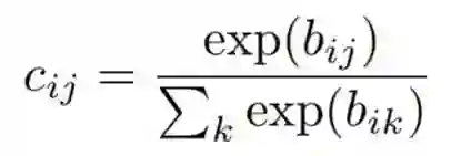 胶囊i和其上一层中所有胶囊的耦合系数的和为1,并由“routing softmax”决定。这个“routing softmax”的初始逻辑值bij 是胶囊i耦合于胶囊j的对数先验概率。