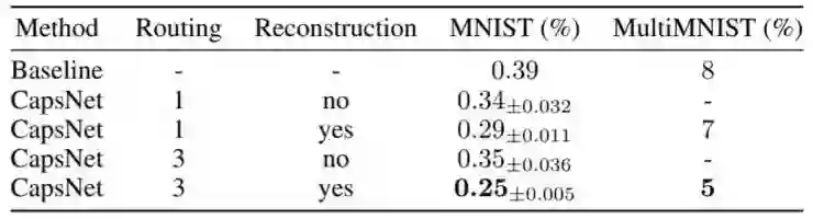 表1 也着重表现了这一任务中胶囊之间路由的重要性。作为CapsNet分类器准确率的对比基线,作者们一开始先训练了带有两层卷积层和两层全连接层的卷积神经网络。 第一层有512个大小为9*9的卷积核,步长为1;第二层有256个大小为5*5的卷积核,步长为1。在每个卷积层后,模型都连接了一个2*2大小,步长2的池化层。 第三层是一个1024维的全连接层。