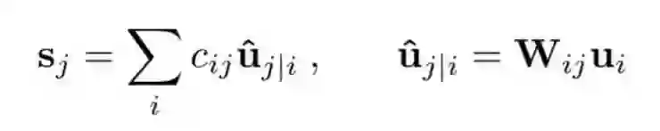 除了第一层胶囊,胶囊sj的全部输入是对预测向量uj|i的加权求和。这些预测向量都是由低一层的胶囊产生,通过胶囊的输出ui 和一个权重矩阵Wij相乘得来。