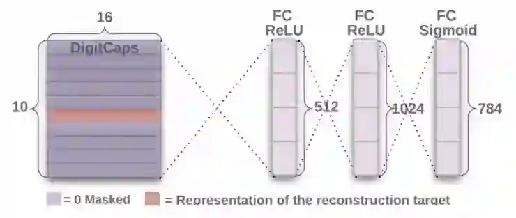 作者们使用了一个额外的重构损失,希望数字胶囊能对输入数字的实例化参数做编码。在训练过程中,作者们用掩蔽的方法只把正确的数字胶囊的激活向量保留下来。然后用这个激活向量来做重构。数字胶囊的输出会传入一个由3个全连接层组成的解码器,它的结构如图2,用来建模像素密度。