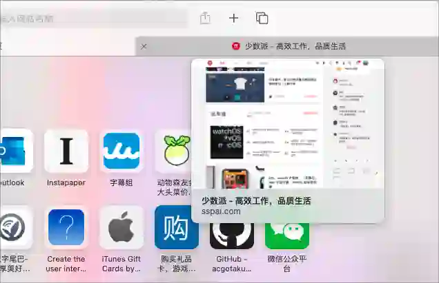 除了起始标签页的自定义功能,Safari 标签栏还改进了浏览时的交互体验和便利性。将鼠标光标停留在 Safari 标签页上时,浏览器会自动加载页面的预览小窗口,以便我们快速浏览窗口内容、找到特定标签页。